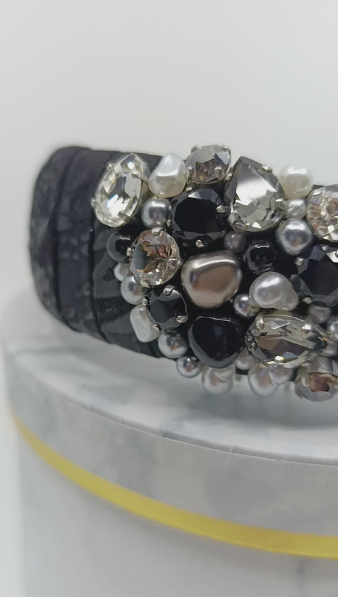 Made from black textured fabric with a touch of metallic shimmer, this headband is classic and chic. On one side, crystals in grey, black, and clear shine in silver settings, paired with pearls in grey, black, and white. Crystals are ranging from 8mm to 14mm in size